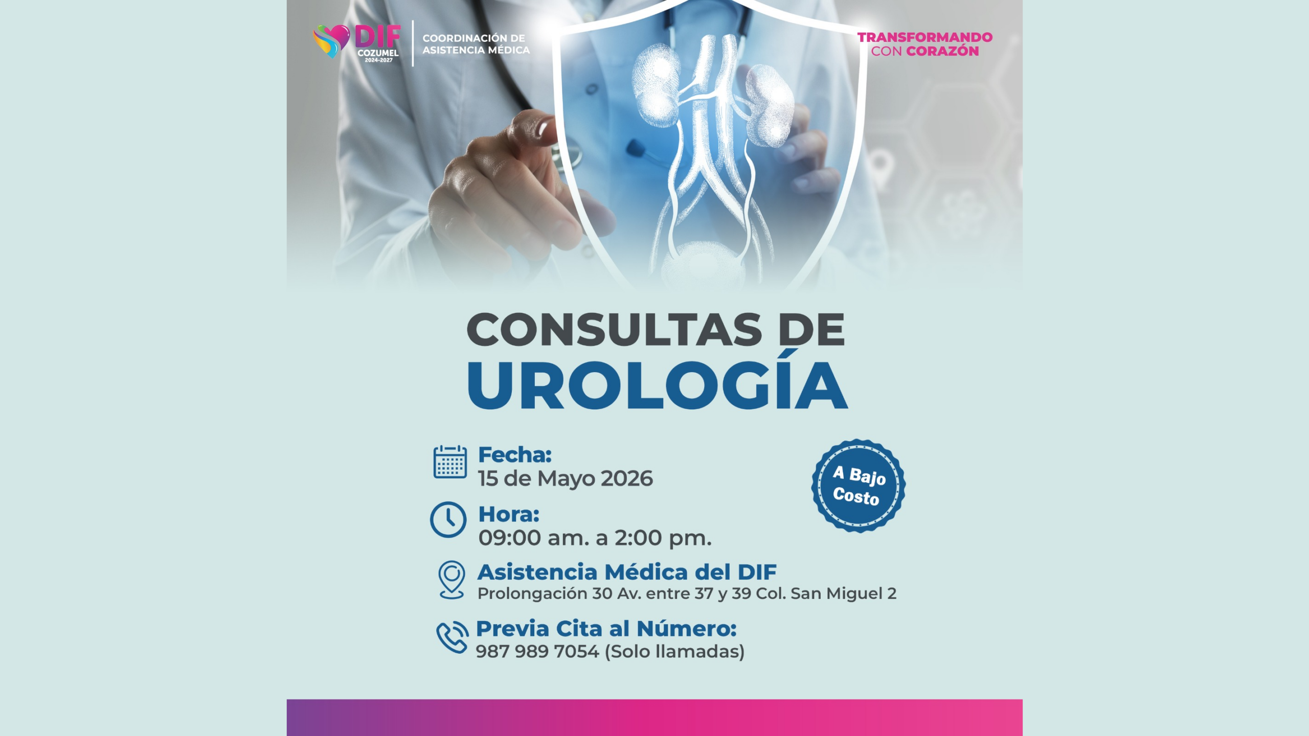 Cozumel, Quintana Roo. – Con el firme compromiso de velar por la salud integral de las familias cozumeleñas, el Sistema DIF Cozumel, a través de la Coordinación de Asistencia Médica, invita a la ciudadanía a participar en la próxima jornada de Consultas de Urología, la cual se llevará a cabo el próximo 15 de mayo de 2026.