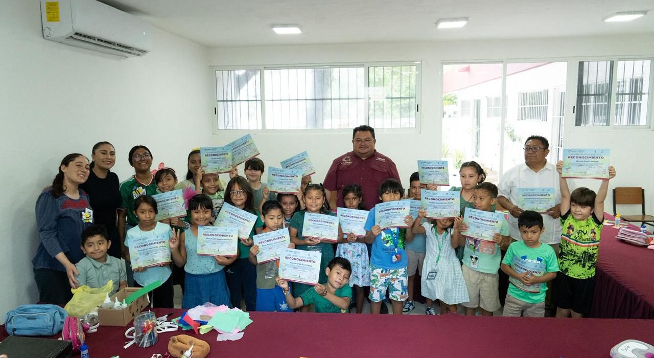 Cozumel.- Con la participación de 30 niñas y niños, el presidente municipal José Luis Chacón Méndez clausuró el curso “En primavera la biblioteca te espera” “Cuentos que florecen”, el cual tuvo como objetivo fomentar el aprendizaje y amor por la lectura donde las y los participantes disfrutaron al máximo una semana de actividades enfocadas en la lectura, la escritura y el conocimiento del entorno natural de la isla.